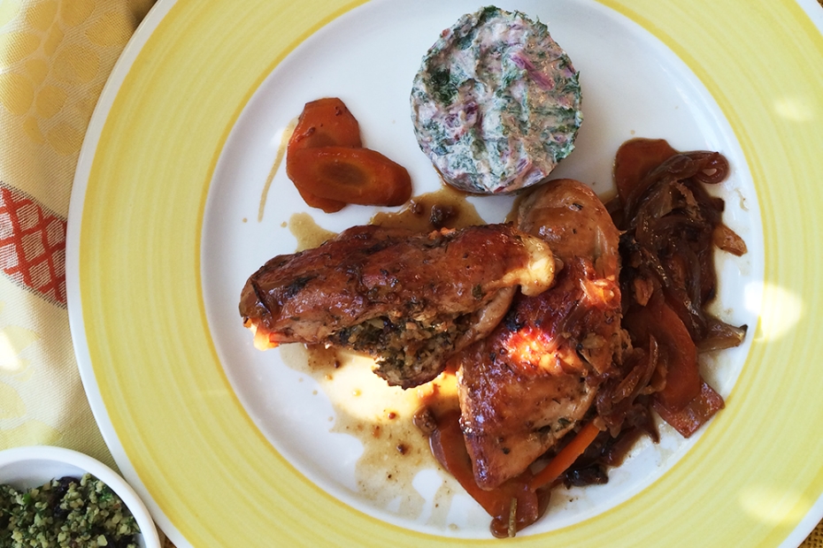 Chicken Breast Stuffed with Walnut-Mint-Raisin Bulgur, Honey-Glazed Carrots, Beet Green Tzatziki