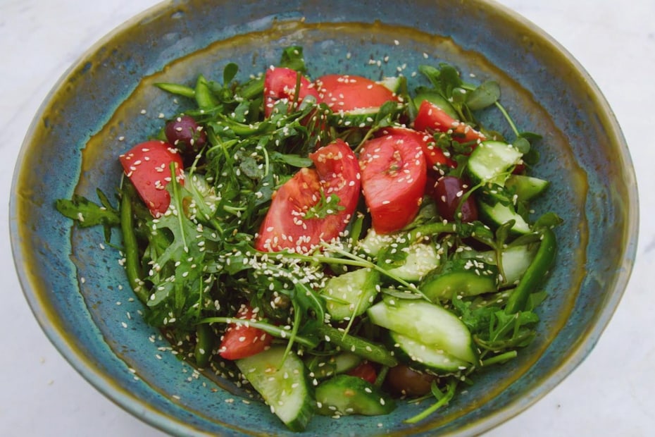 The classic recipe for a Greek salad calls for everything listed below, plus feta. In this version, made together with ultra marathoner Dean Karnazes when we met, ran and filmed in Messinia, in the southern Peloponnese, I leave out the feta but get plenty of healthy calcium from the addition of sesame seeds.