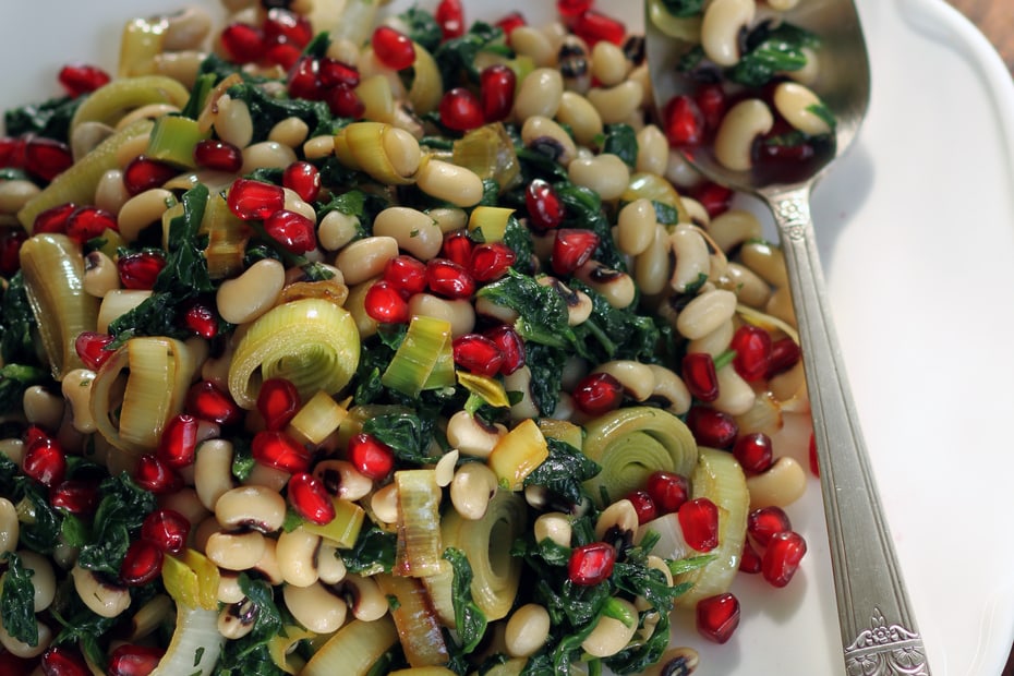 Black-eyed peas are a traditional good-luck dish at New Year’s throughout much of the American South and elsewhere. In Greece, it doesn’t have to be New Year’s to enjoy them. This is a modern take on a traditional Greek stew of black-eyed peas and greens, gussied up with some delicious pomegranate.