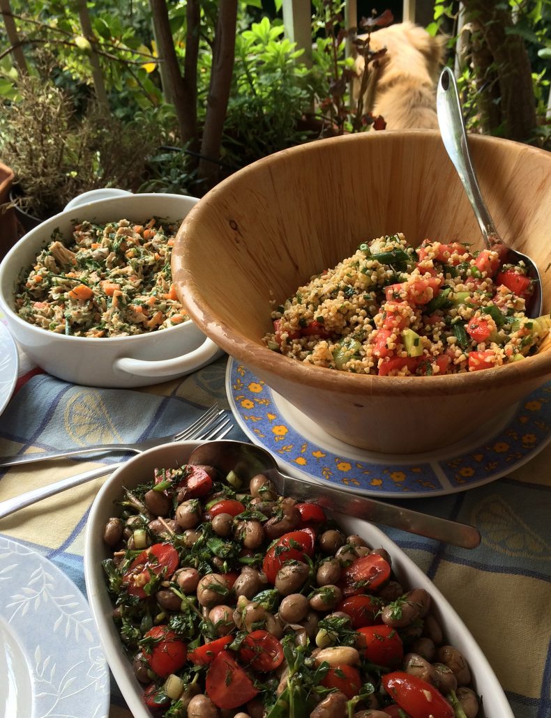 Three great Greek salads, with cranberry beans, tuna-yogurt, and taboule, filled with great nutrition and taste.