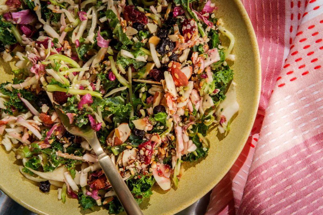 KALE, CABBAGE SLAW WITH ALMONDS, DRIED FRUITS AND SEEDS
