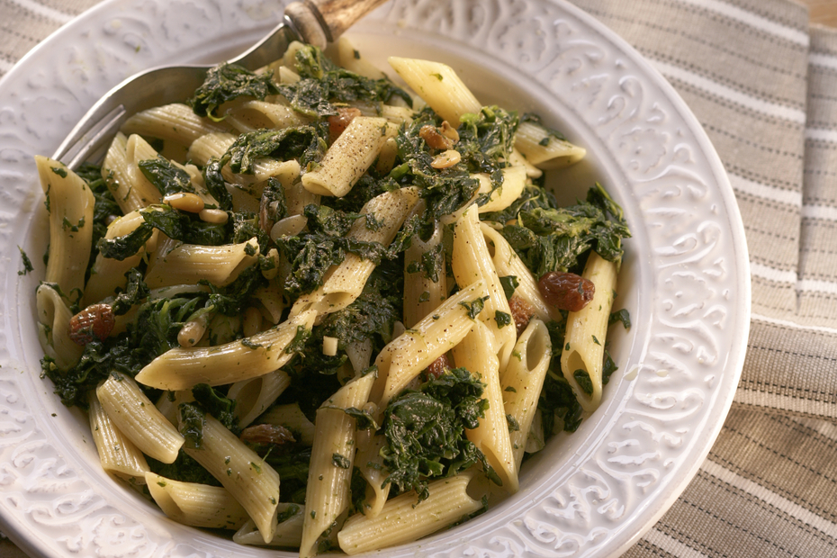 Pasta with spinach, raisins and pine nuts is a delicious combo with ancient flavor tones.