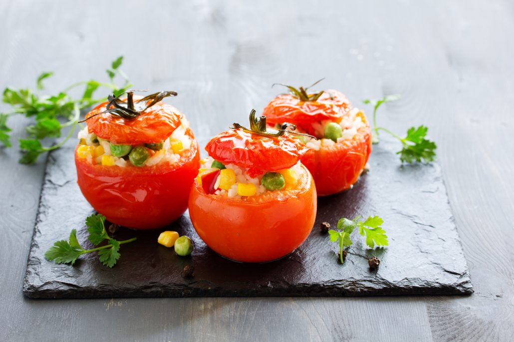 Greek Vegan Stuffed Tomatoes with Rice, Corn & Herbs