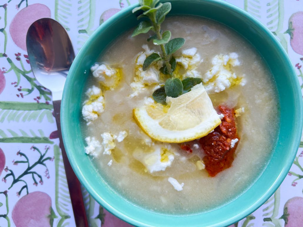 Simple Trahana Soup with Spiced Red Pepper Puree, Greek Feta and Olive Oil