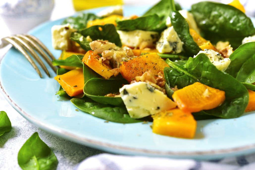 ROASTED PUMPKIN SALAD WITH SPINACH, BLUE CHEESE AND NUTS