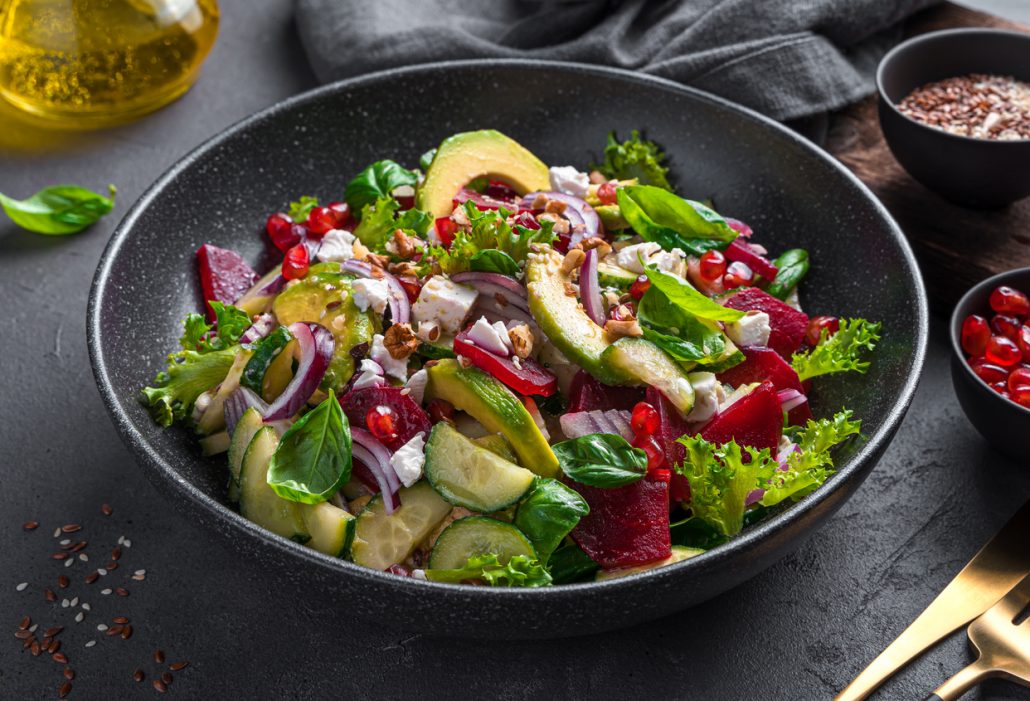GREEN SALAD WITH BEETROOT, AVOCADO, FETA AND WALNUTS