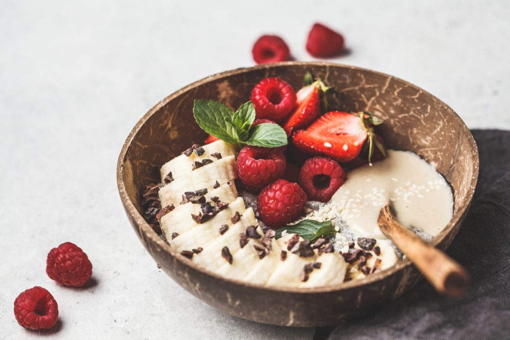 CHIA SEED PUDDING WITH FRESH BERRIES AND DARK CHOCOLATE NIBS