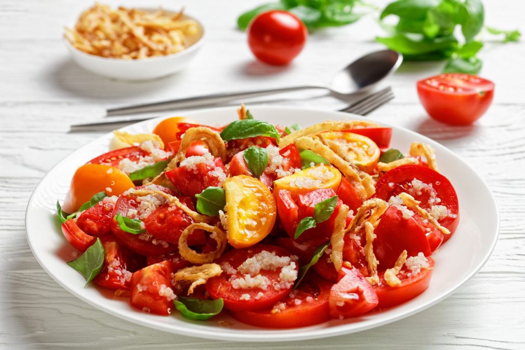 RIPE TOMATO SALAD WITH QUINOA, CRISPY ONIONS AND BASIL