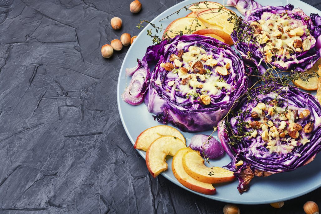 RED CABBAGE STEAKS BAKED WITH APPLES, HAZELNUTS AND FRESH THYME