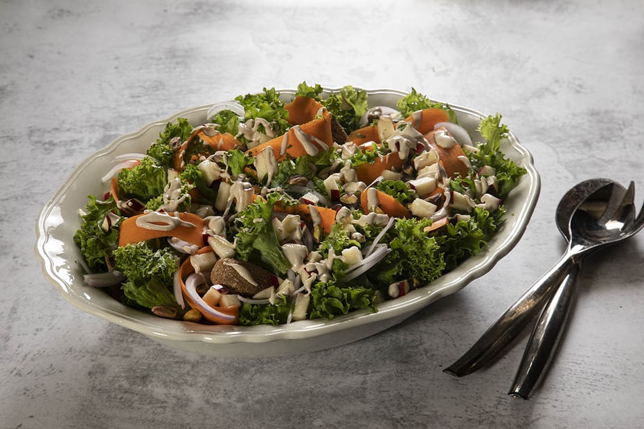 Carrot Ribbon-Apple-Frisee Rusk Salad with Tahini Dressing