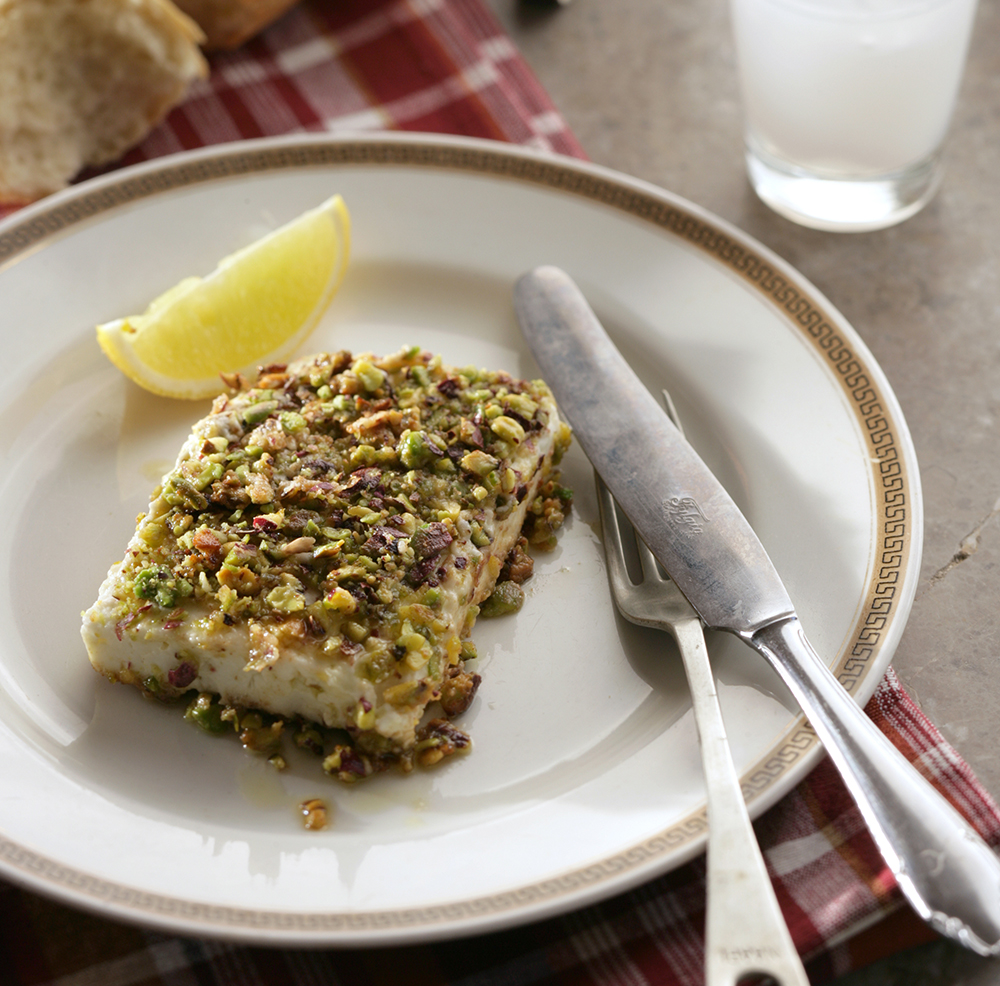Saganaki is a classic Greek Meze, often perfumed with alcohol or with a crust of nuts and/or sesame. Here Mastiha combined with pistachios give this saganaki recipe a delicious twist. You can buy Aegina pistachios here.